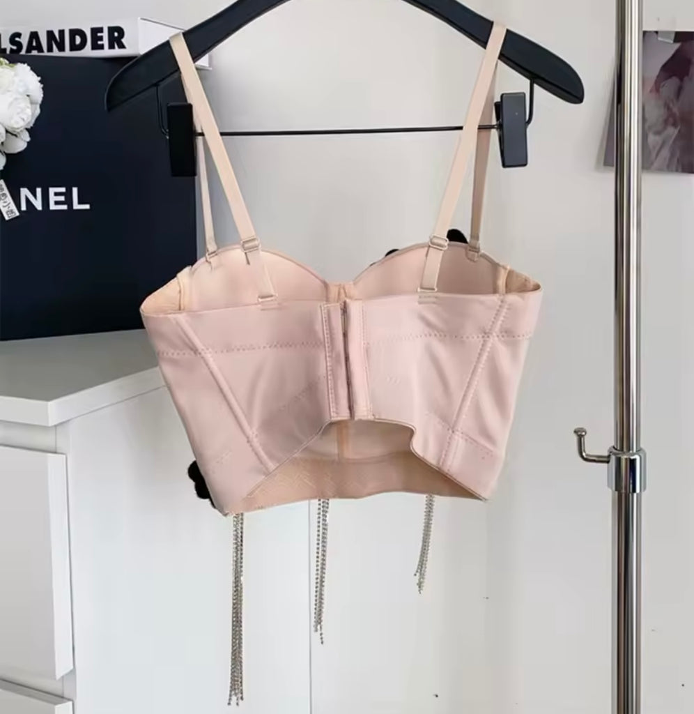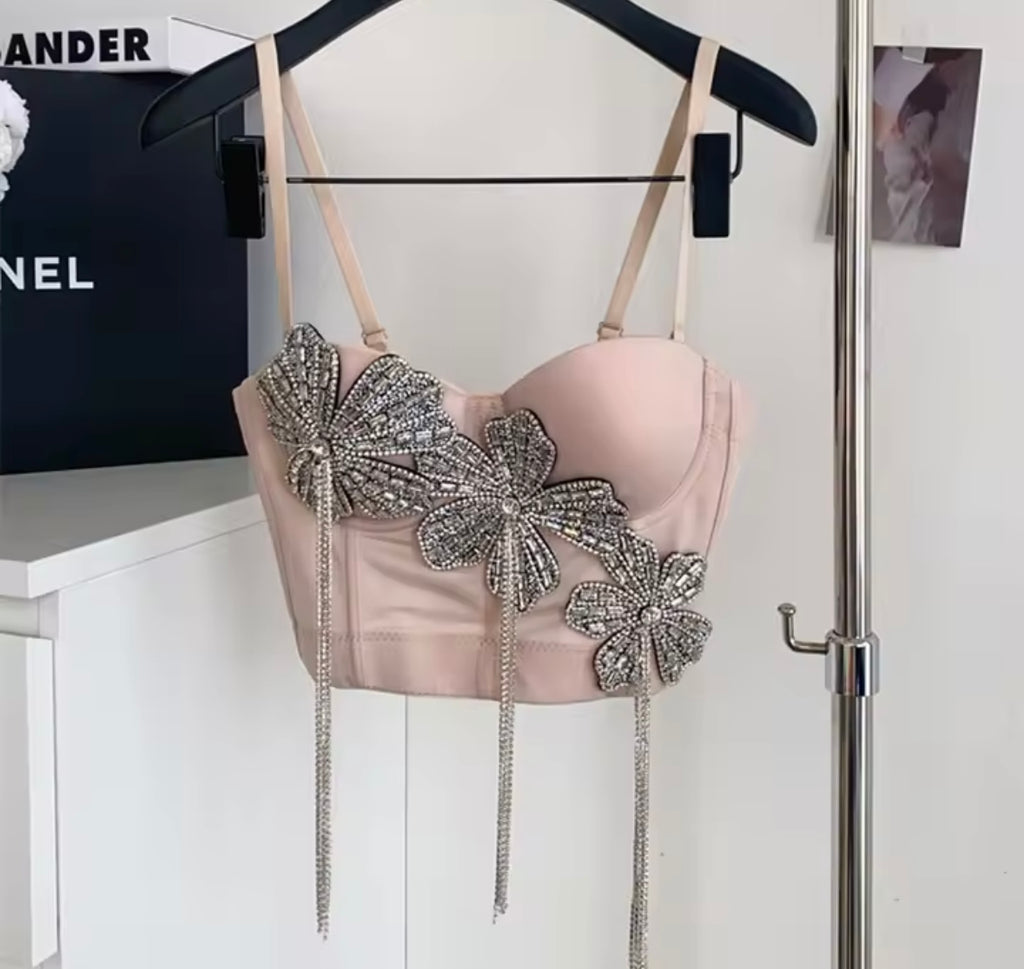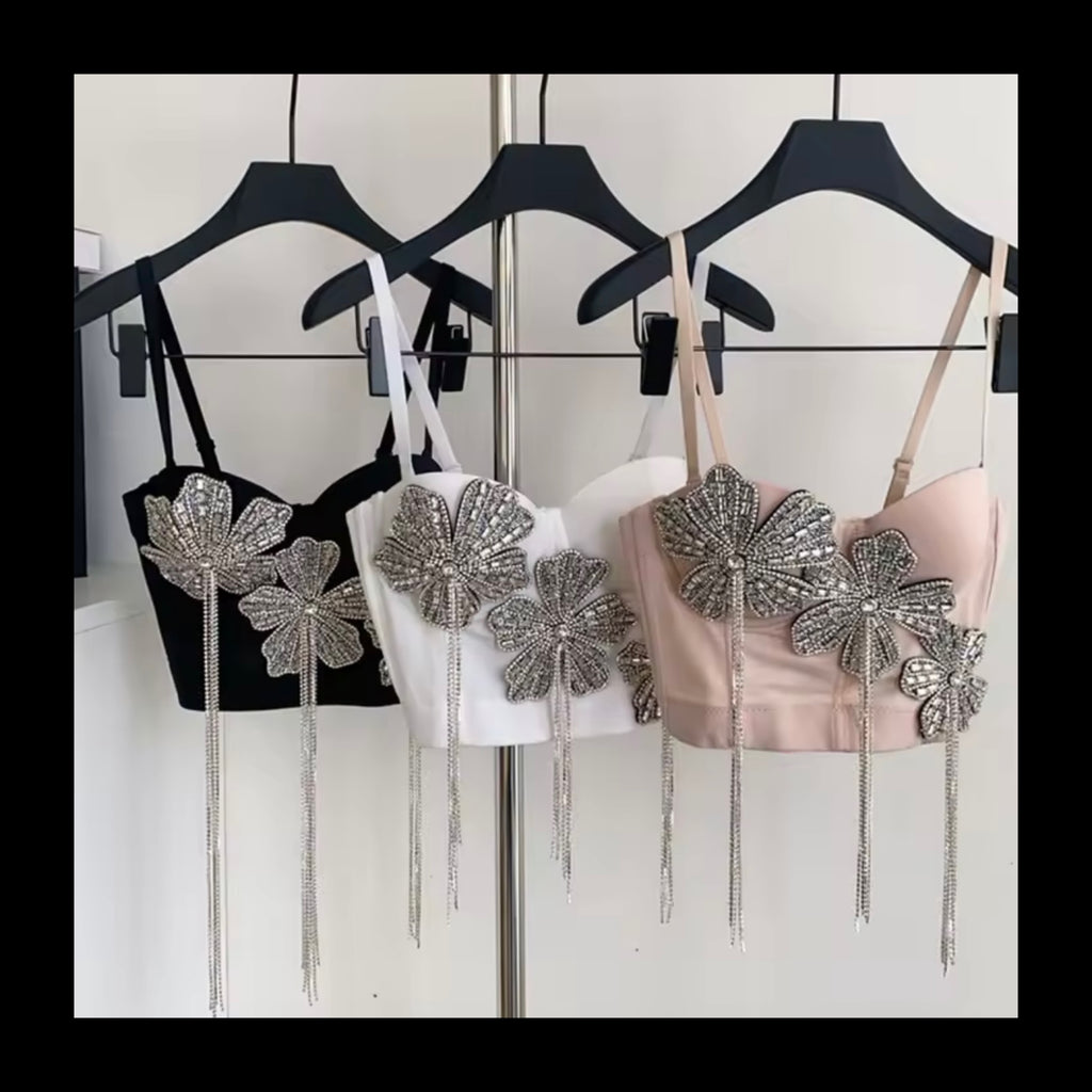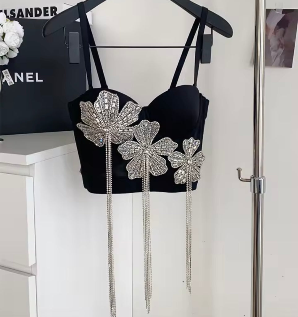 Women Fashion Sleeveless Floral Rhinestone Tassel Top
