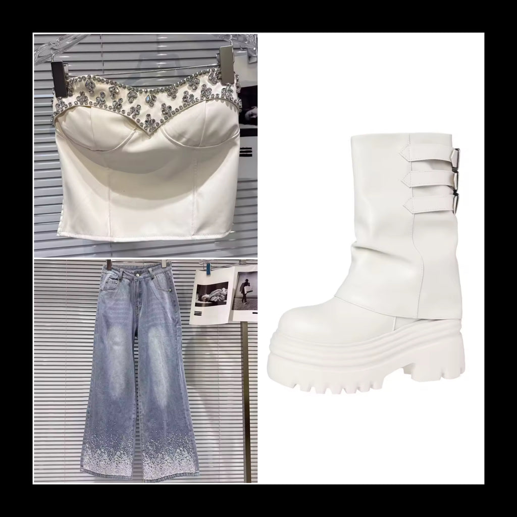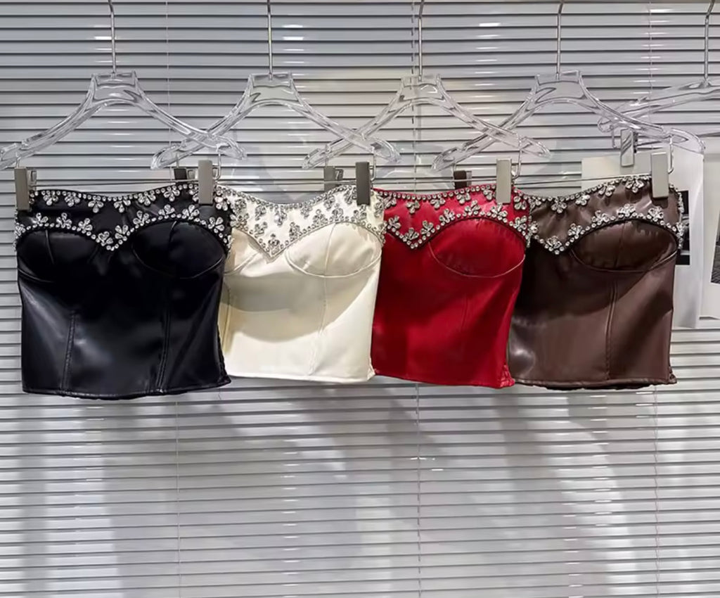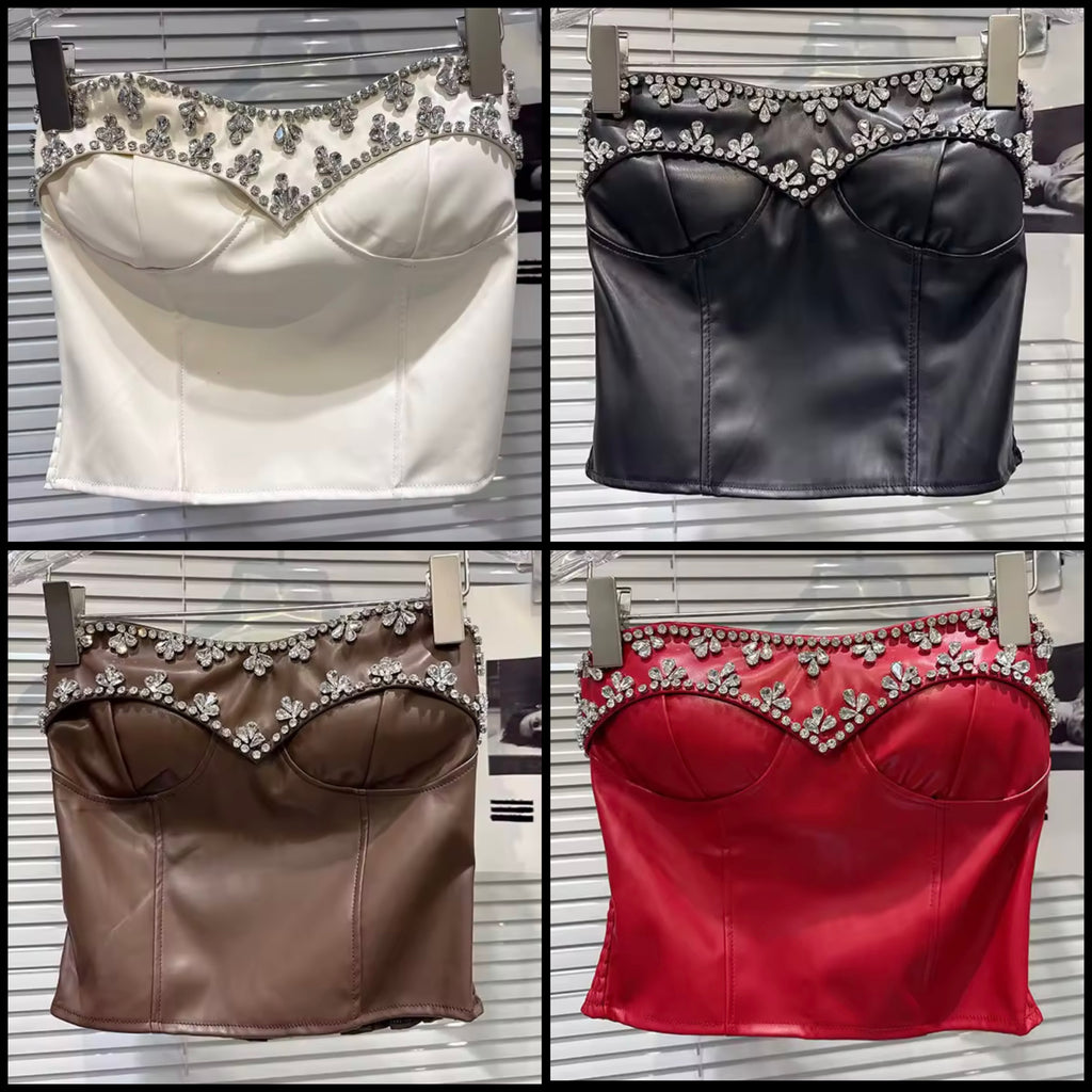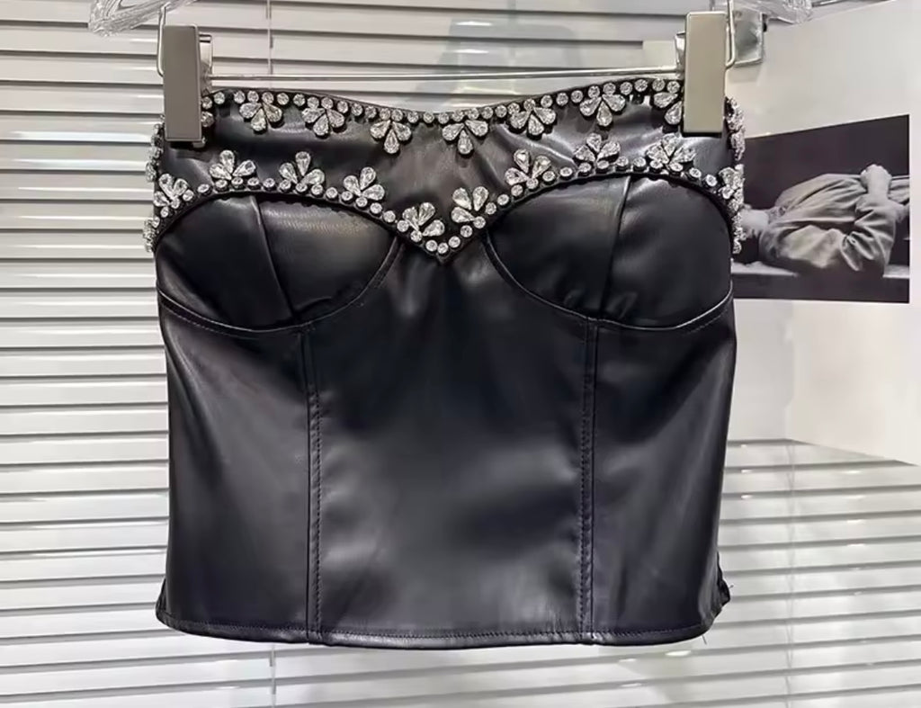 Women Sexy Strapless Floral Rhinestone PU Crop Top
