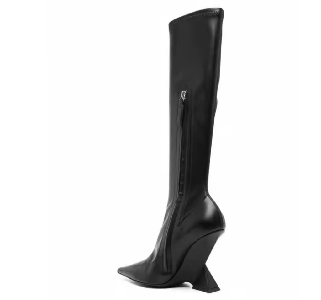 Women Black Buckled Chain Back Zipper Knee High Boots