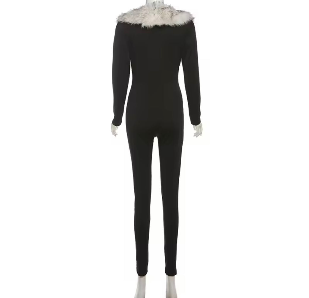Women Black Faux Fur Patchwork Fashion Full Sleeve Jumpsuit