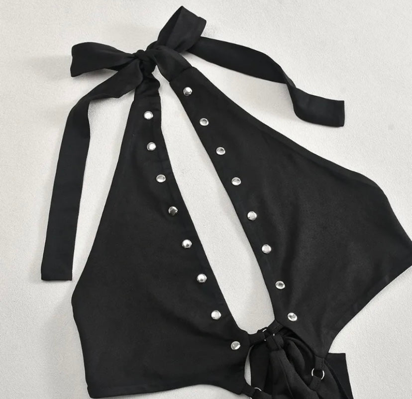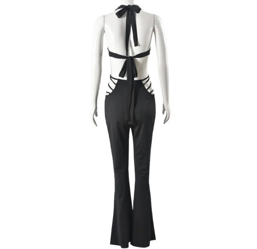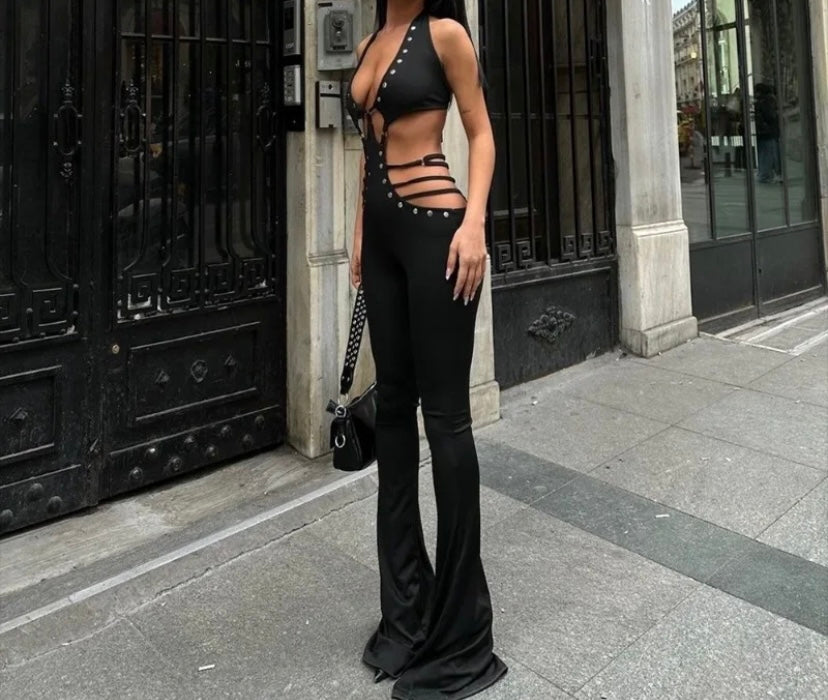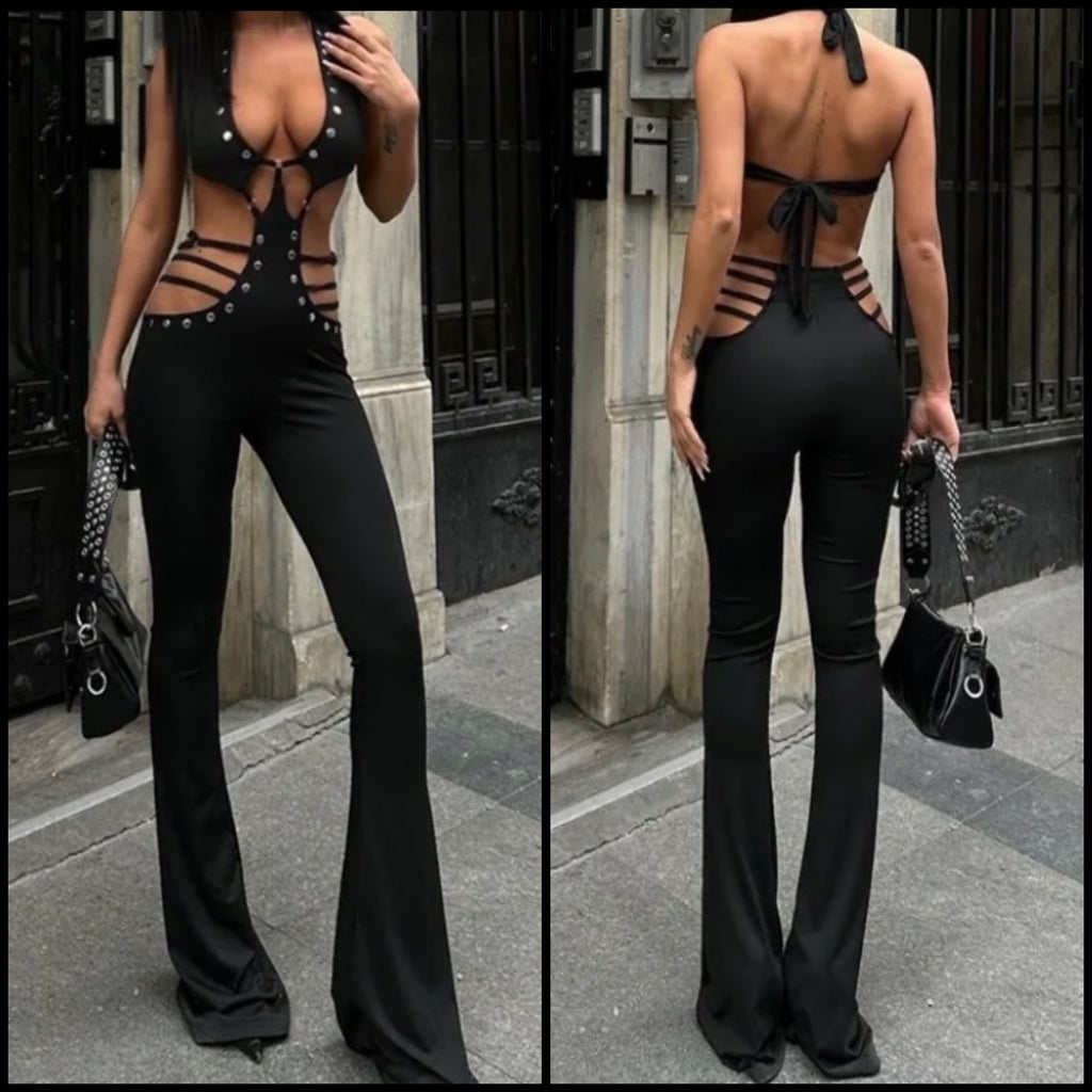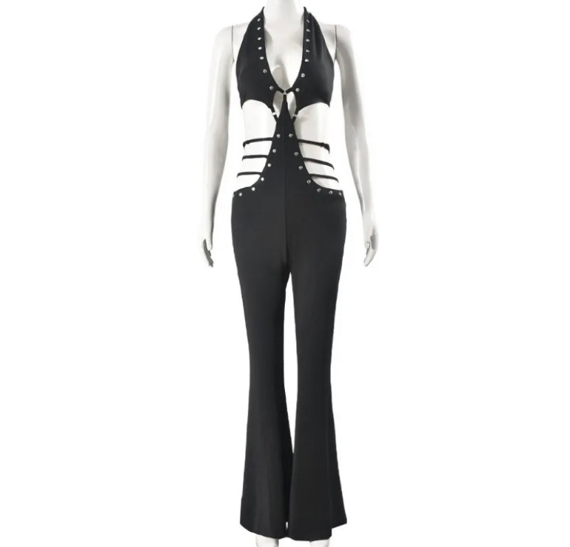 Women Black Sexy Halter Sleeveless Rivet Cut Out Jumpsuit