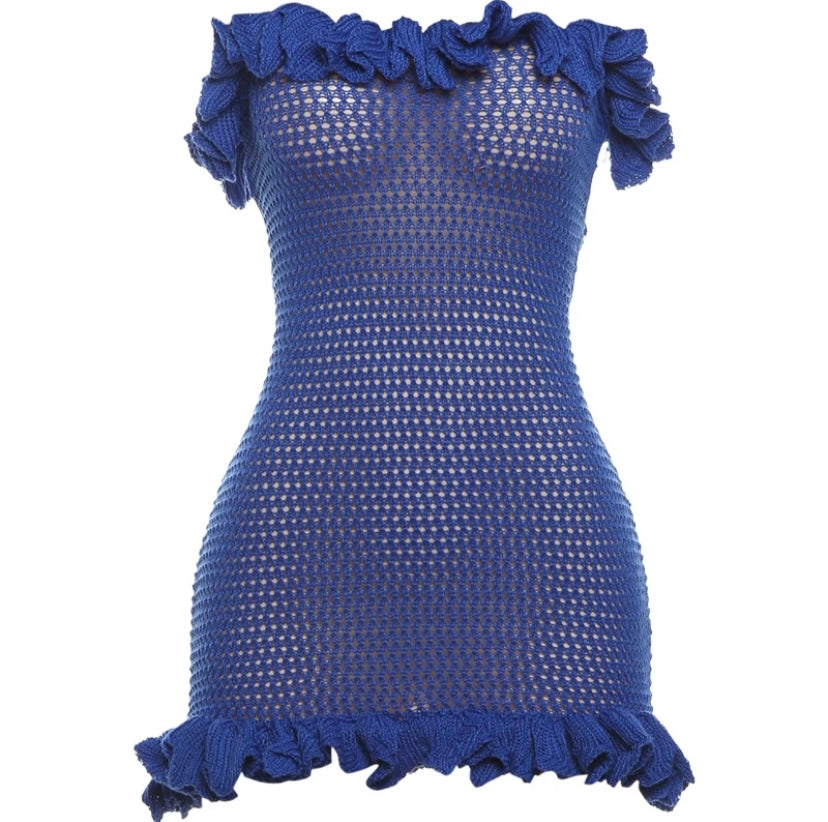 Women Blue Sexy Strapless Ruffled Open Back Knitted Dress