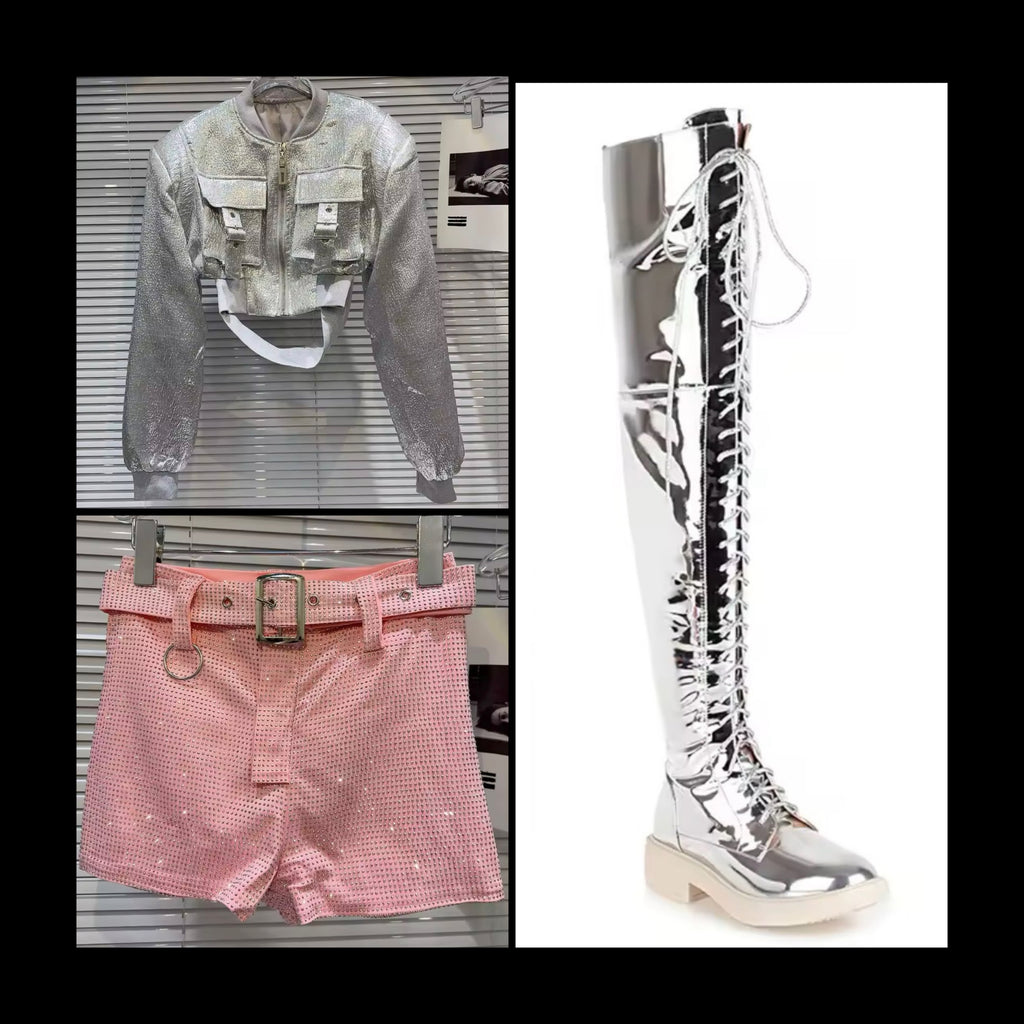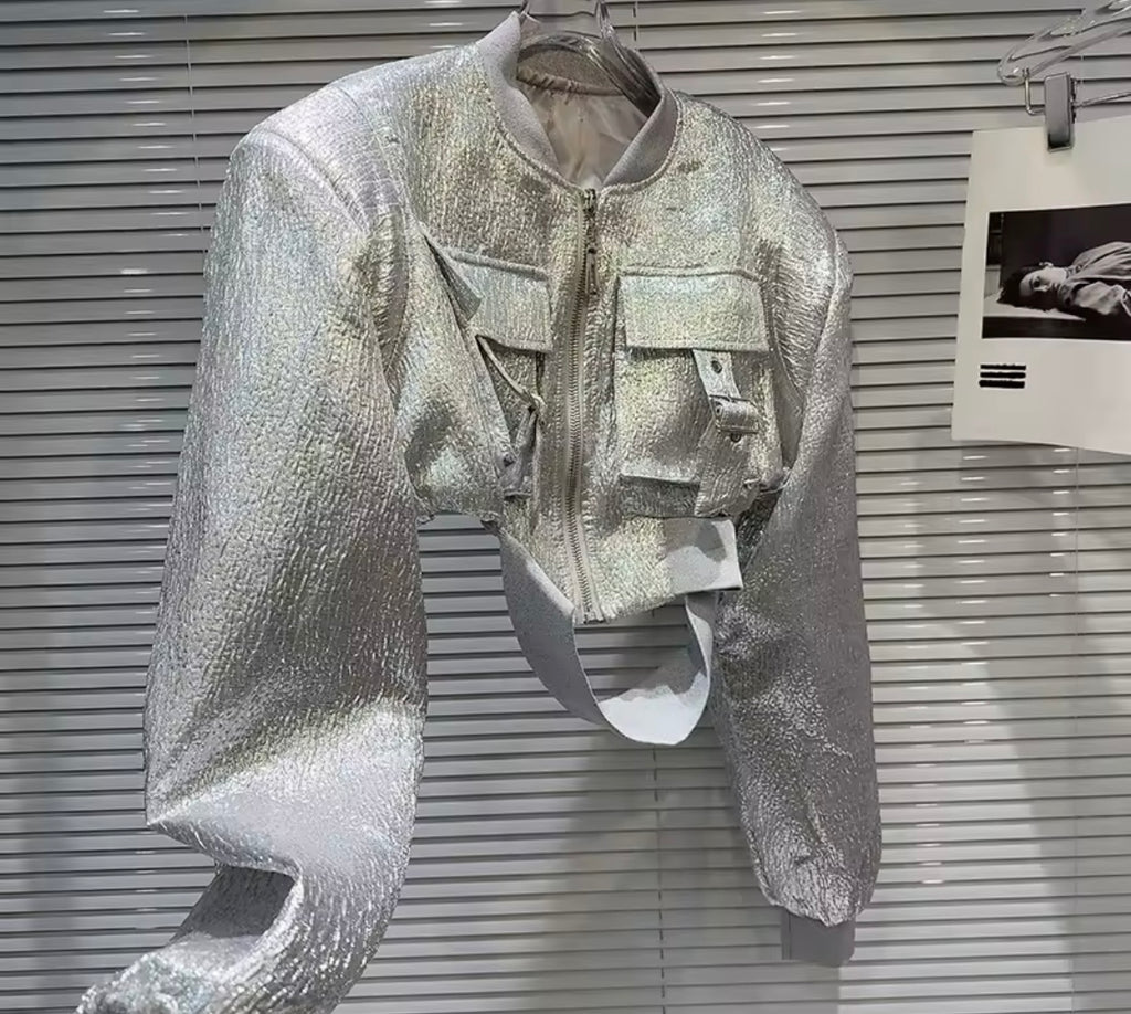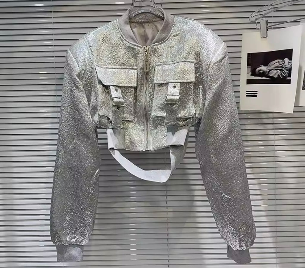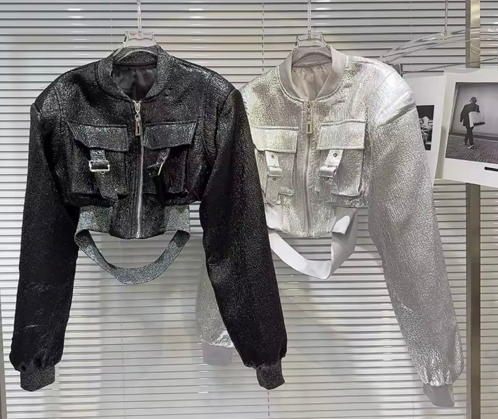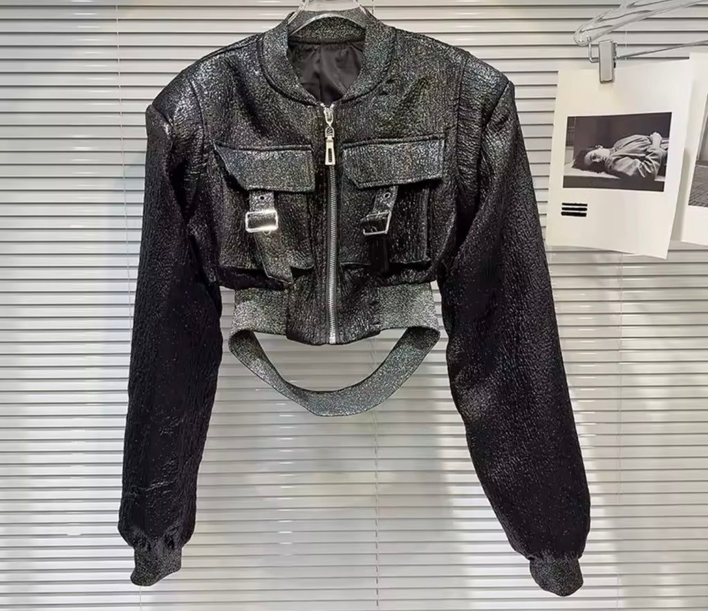 Women Color Fashion Buckled Zip Up Crop Jacket