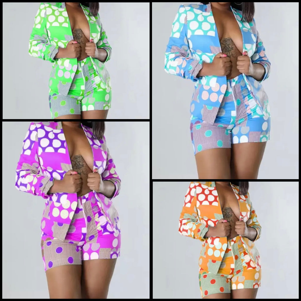 Women Colorful Print Full Sleeve Fashion Blazer Two Piece Short Set