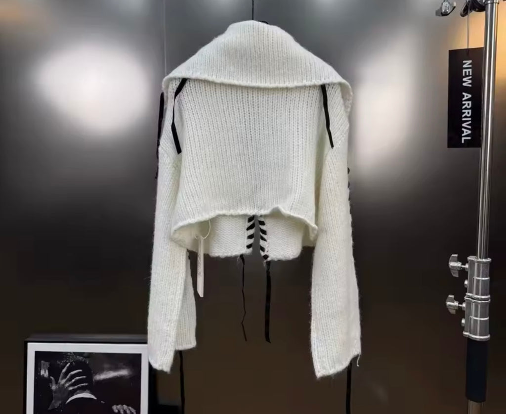 Women Fashion B&W Lace Up Full Sleeve Sweater Top