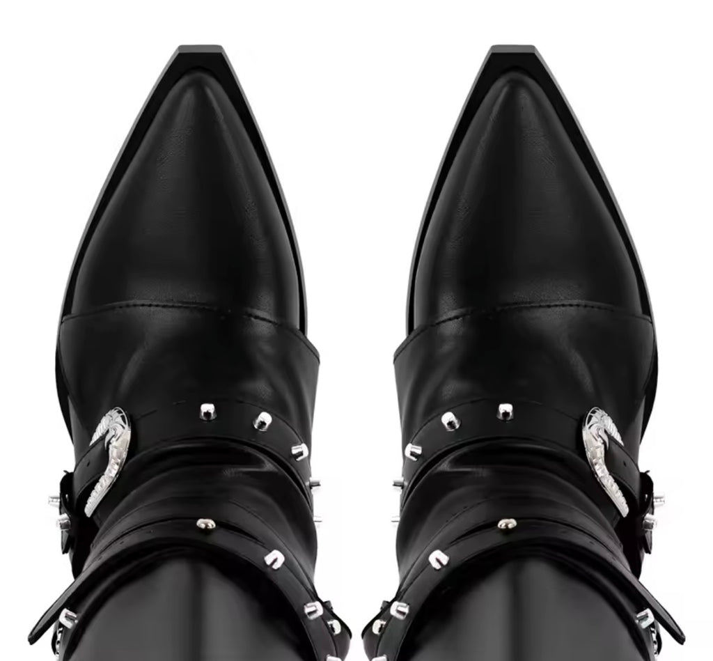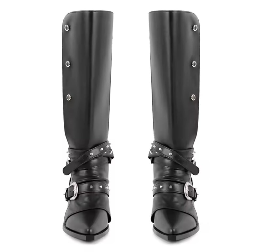 Women Black Buckled Chain Back Zipper Knee High Boots