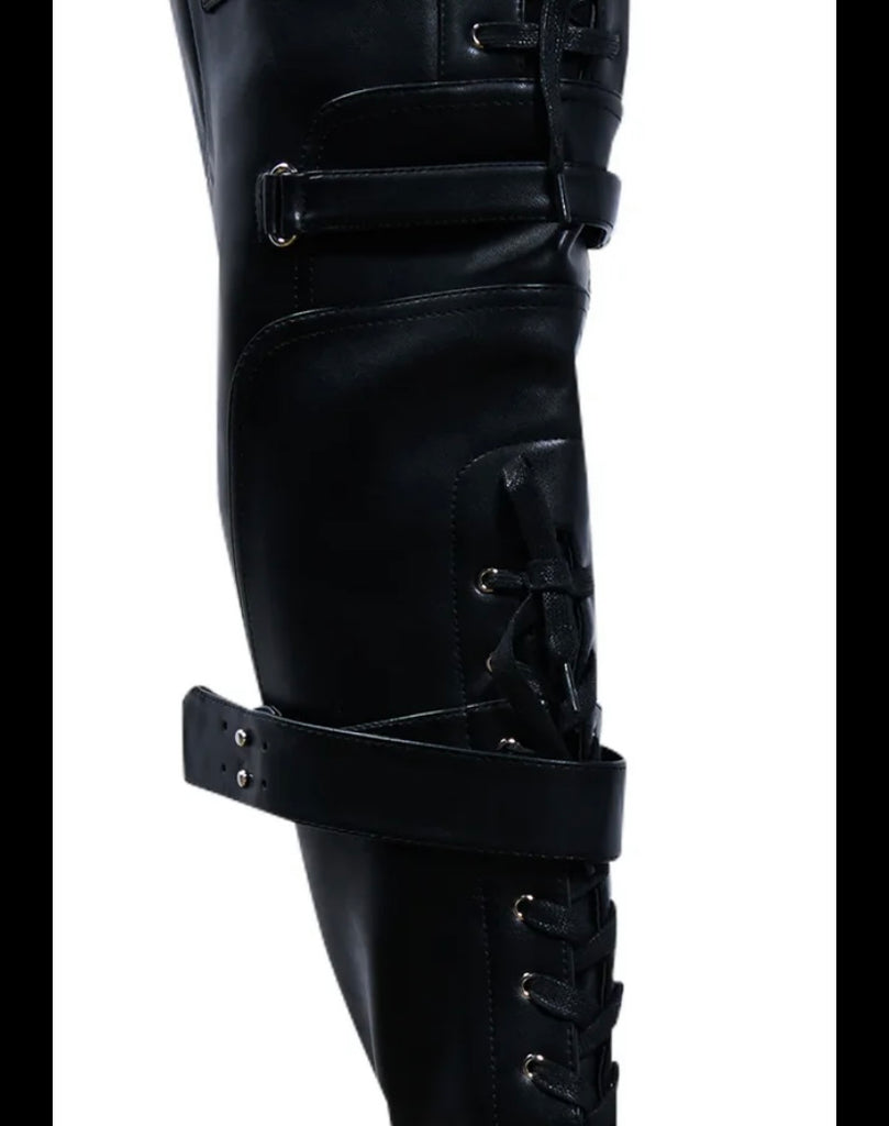 Women Fashion Black Buckled Lace Up Faux Leather Knee High Boots