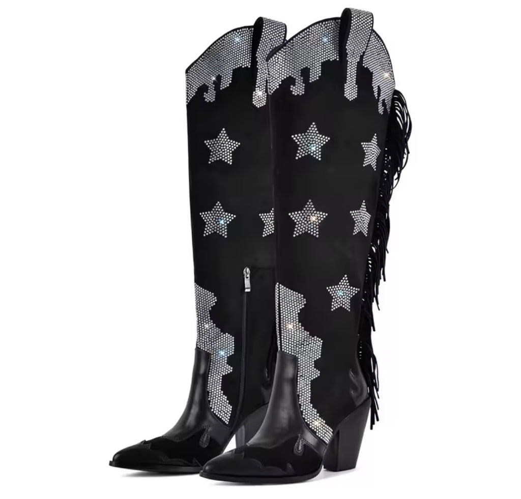 Women Black Buckled Chain Back Zipper Knee High Boots