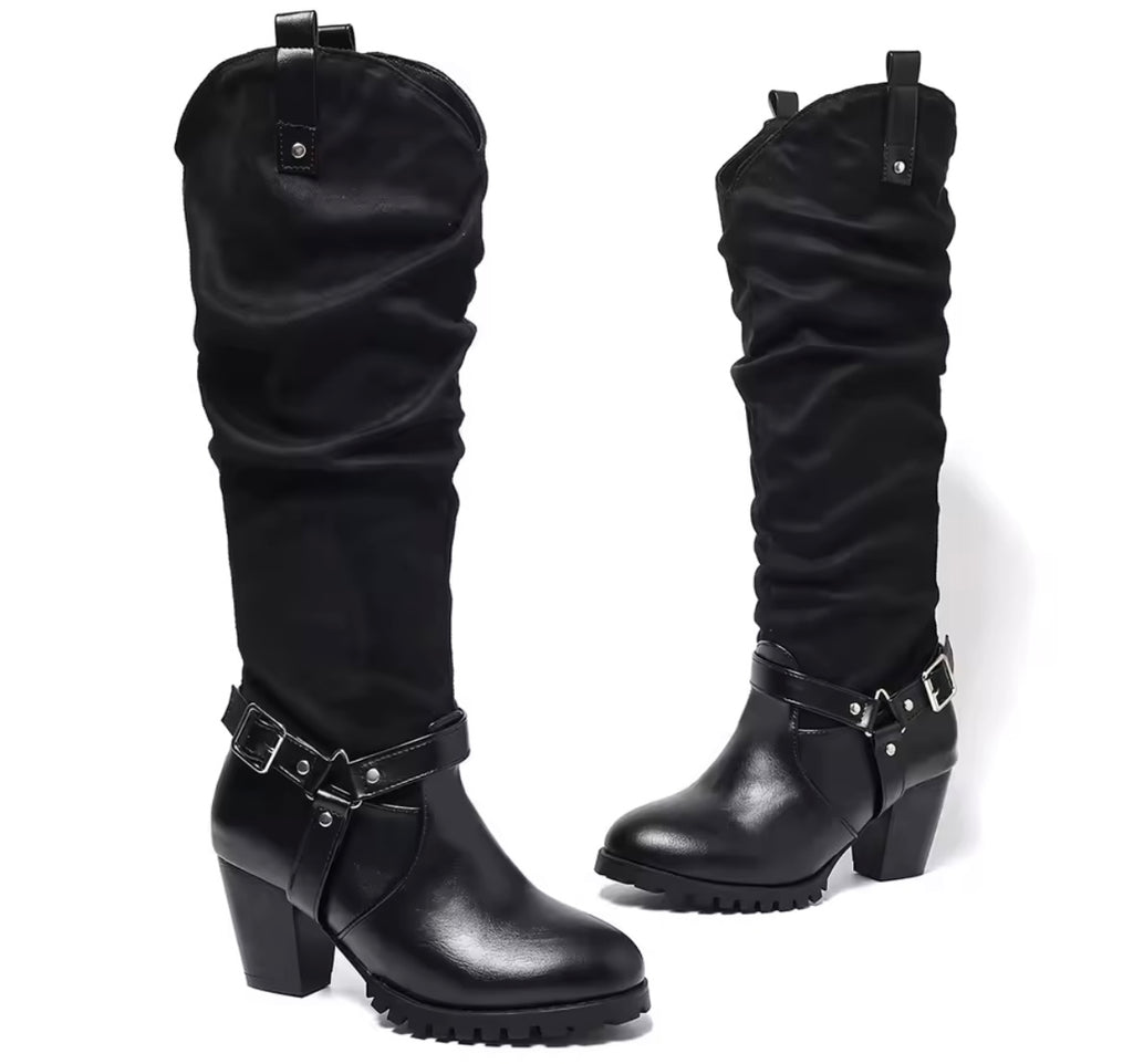 Women Fashion Denim Rivet Buckled High Heel Knee Length Boots