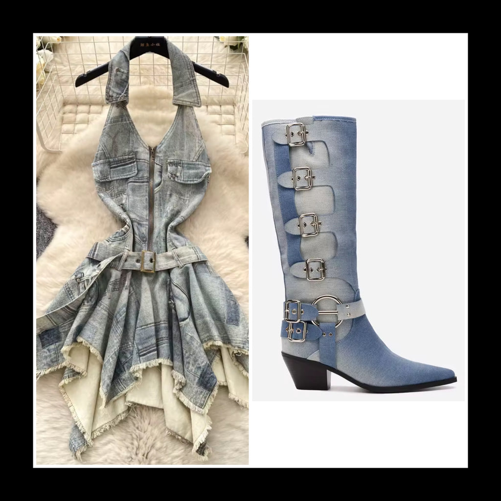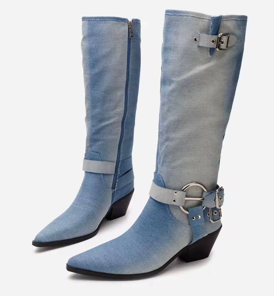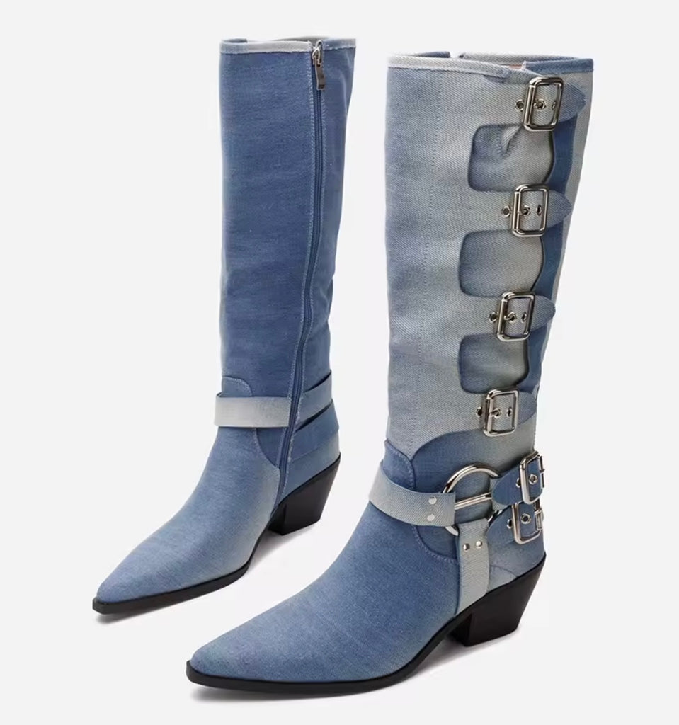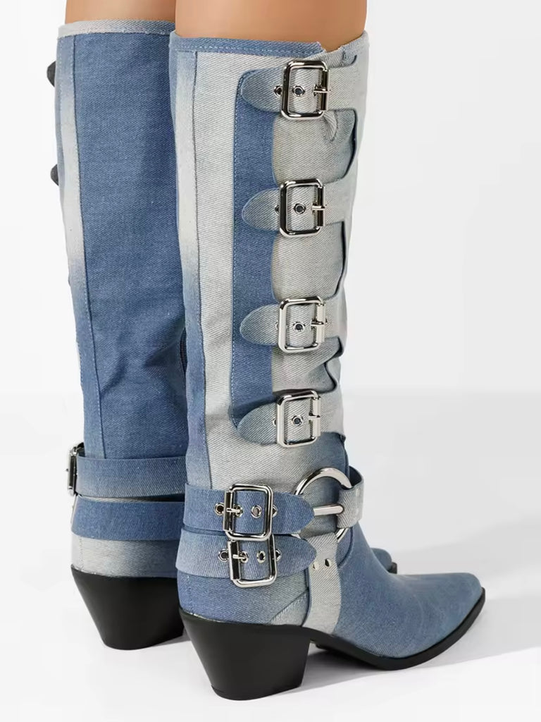 Women Fashion Denim Rivet Buckled High Heel Knee Length Boots