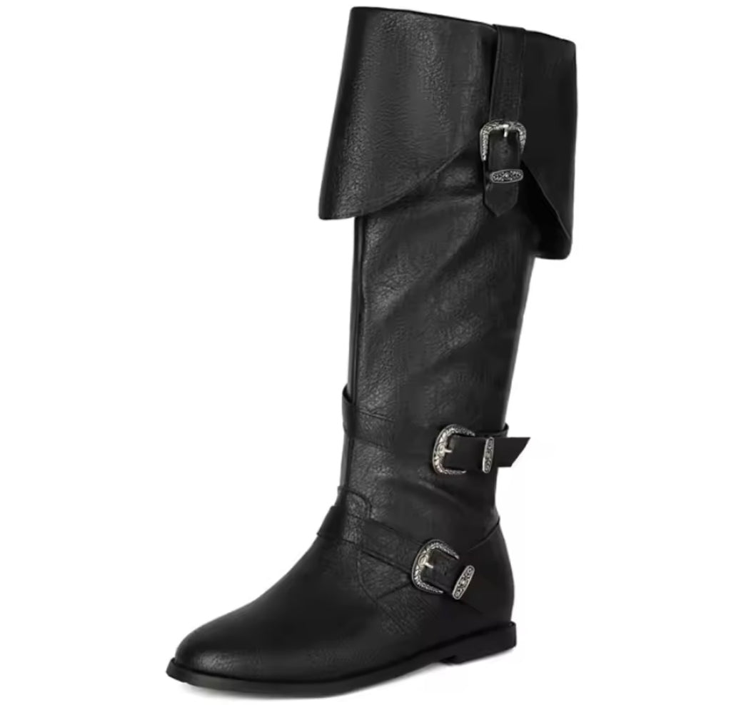 Women Black Buckled Chain Back Zipper Knee High Boots
