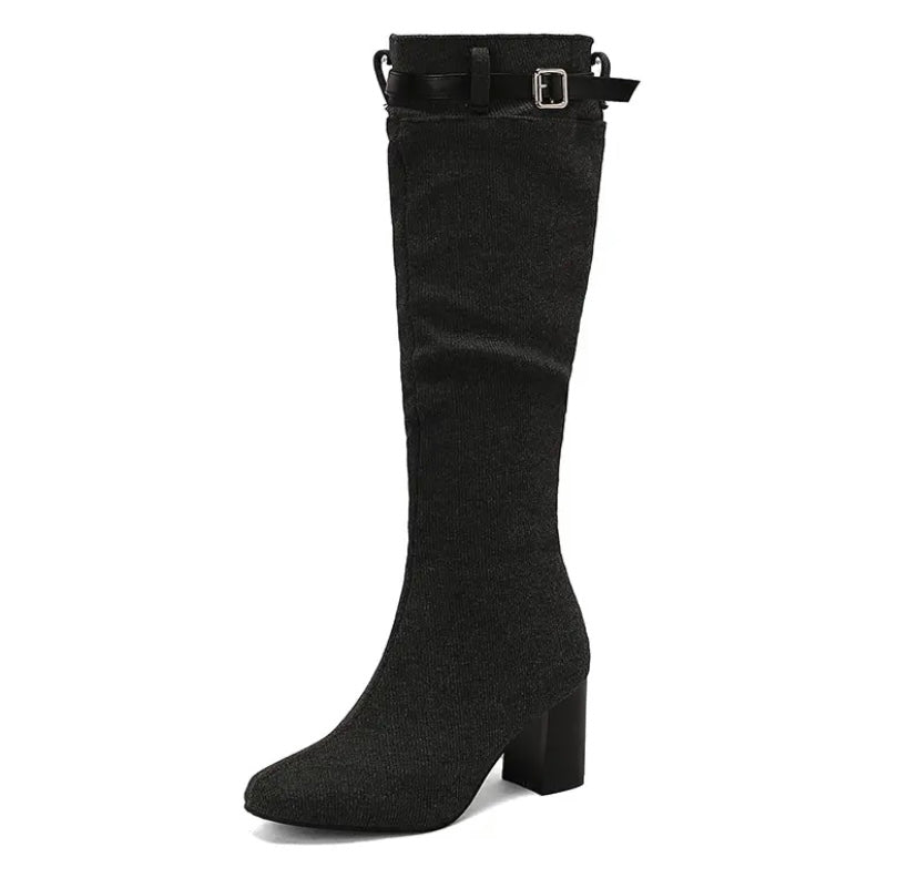 Women Fashion Denim Rivet Buckled High Heel Knee Length Boots