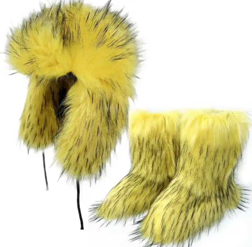 Women Fashion Color Faux Fur Ankle Boots Hat Set