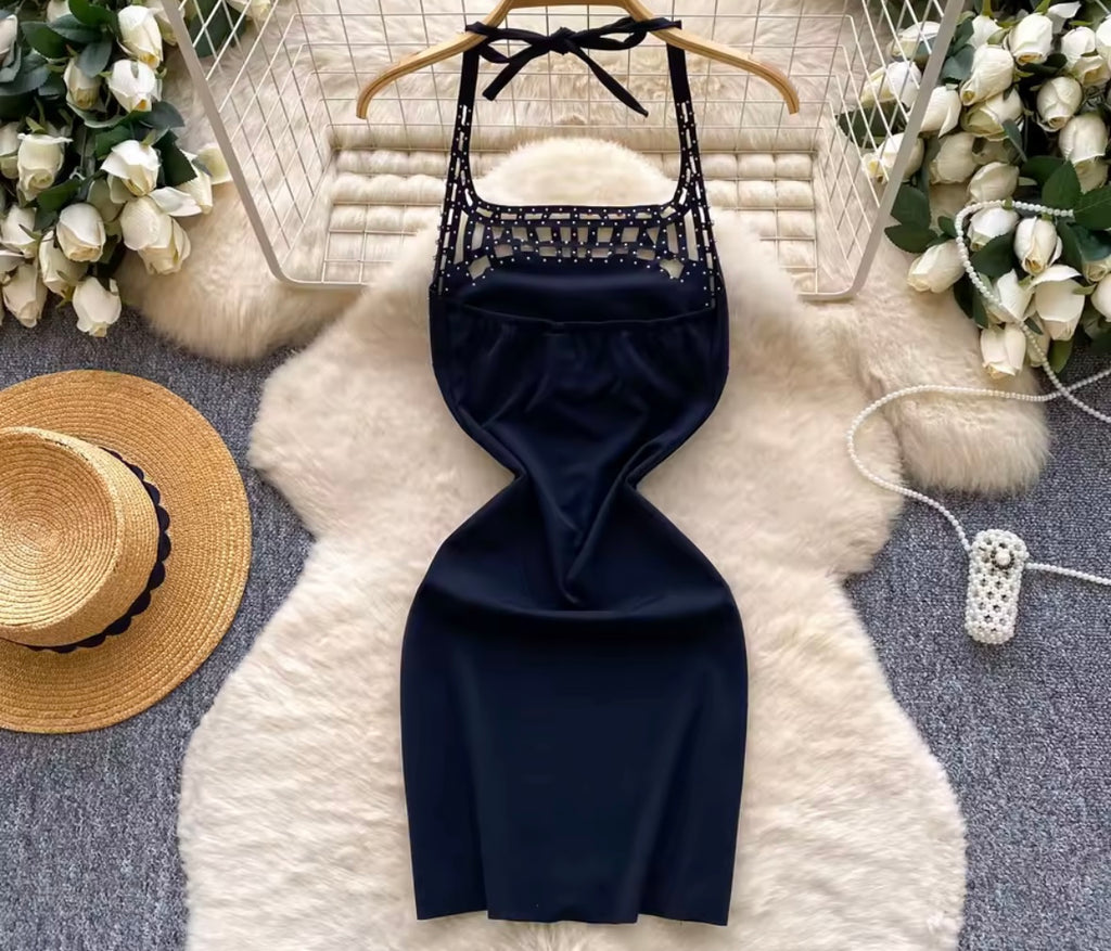 Women Sleeveless Asymmetrical Rhinestone Mesh Dress