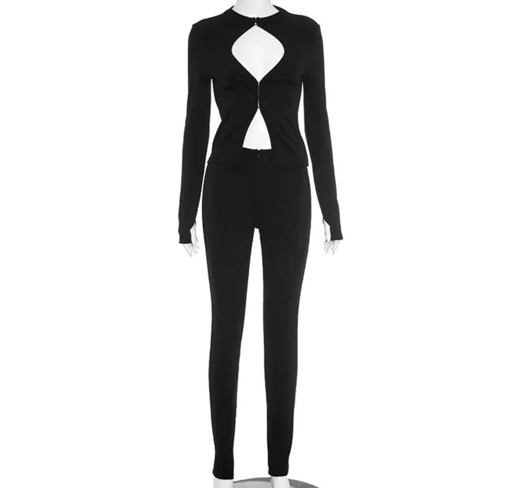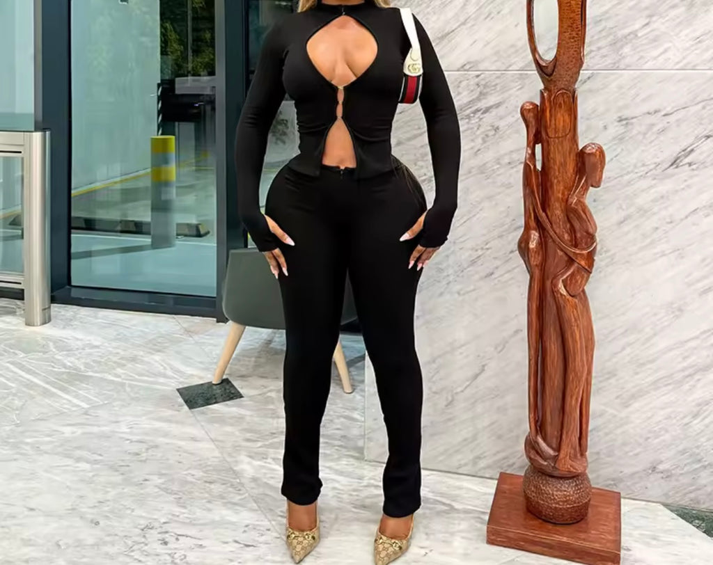 Women Sexy Solid Color Full Sleeve Cut Out Two Piece Pant Set
