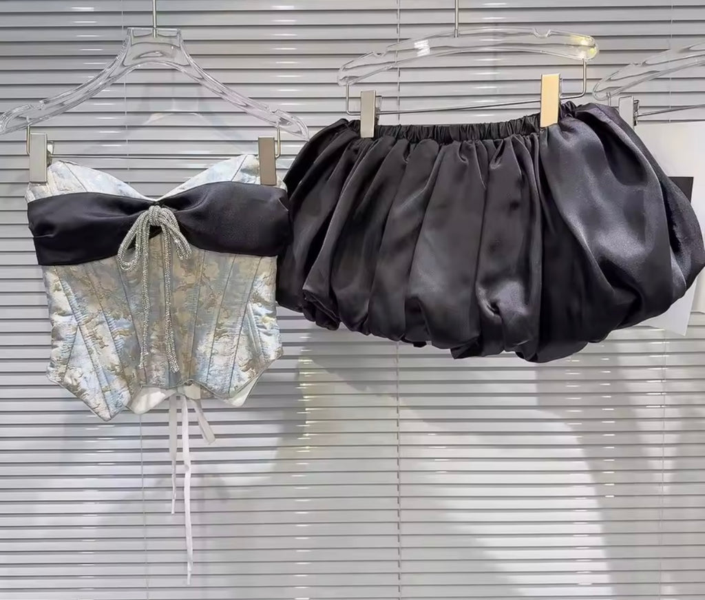 Women Ruffled Bow Tie Full Sleeve Two Piece Bling Skirt Set