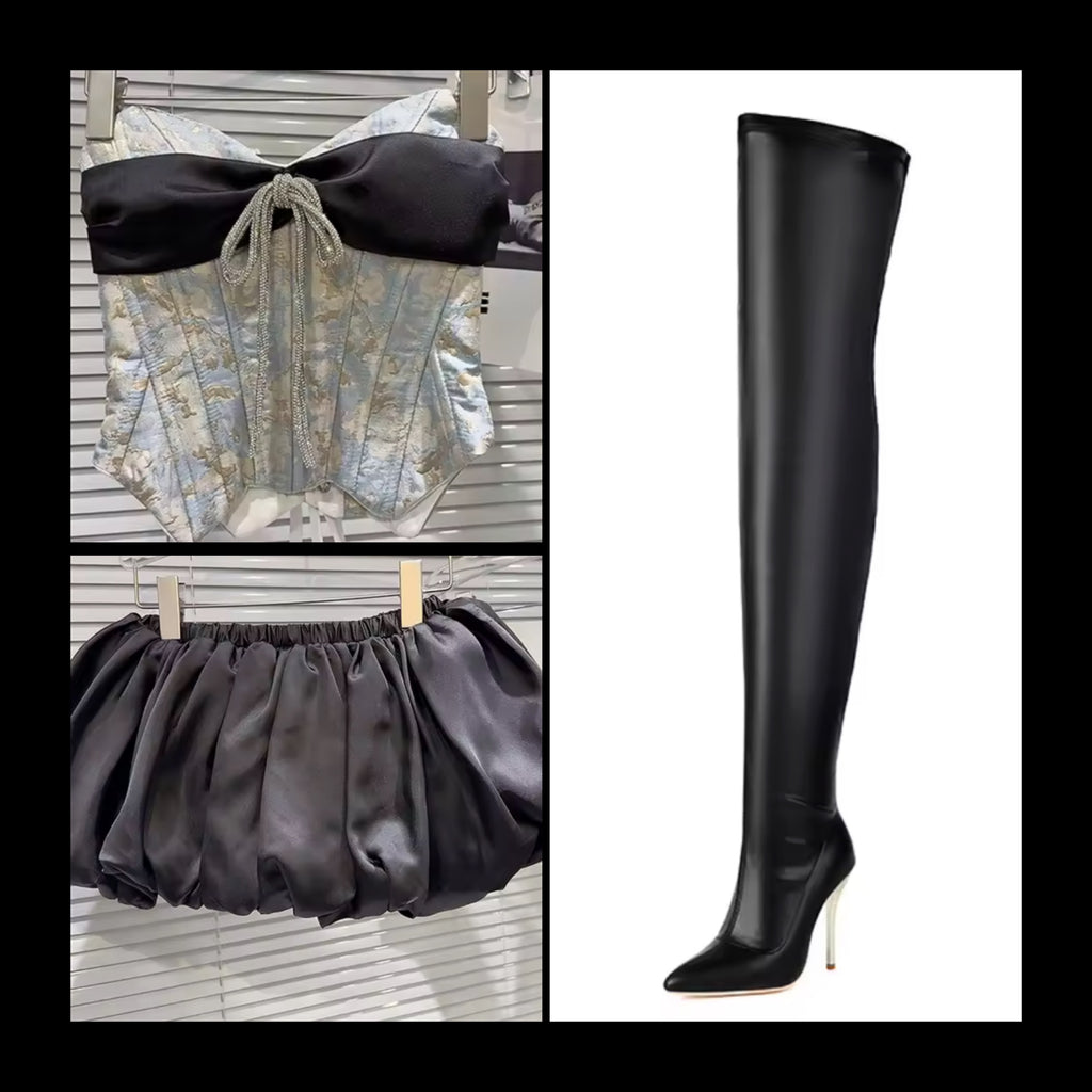 Women Gold Metal Black Faux Leather Jacket Two Piece Skirt Set