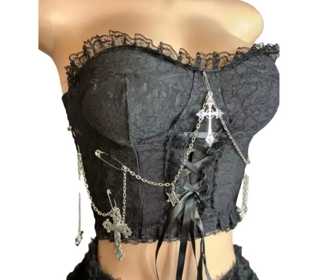 Women Sexy Strapless Cross Chain Lace Fringe Two Piece Skirt Set