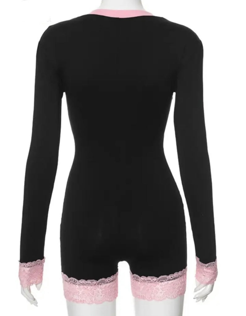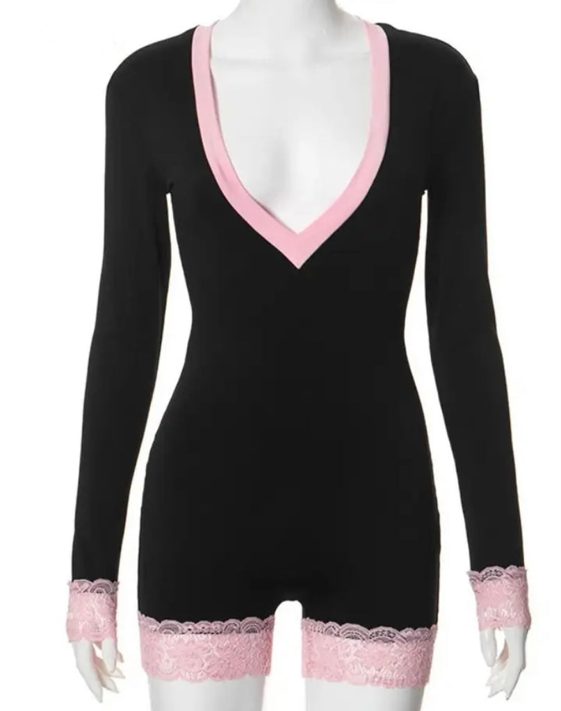 Women Sexy V-Neck Full Sleeve Black Pink Lace Patchwork Romper