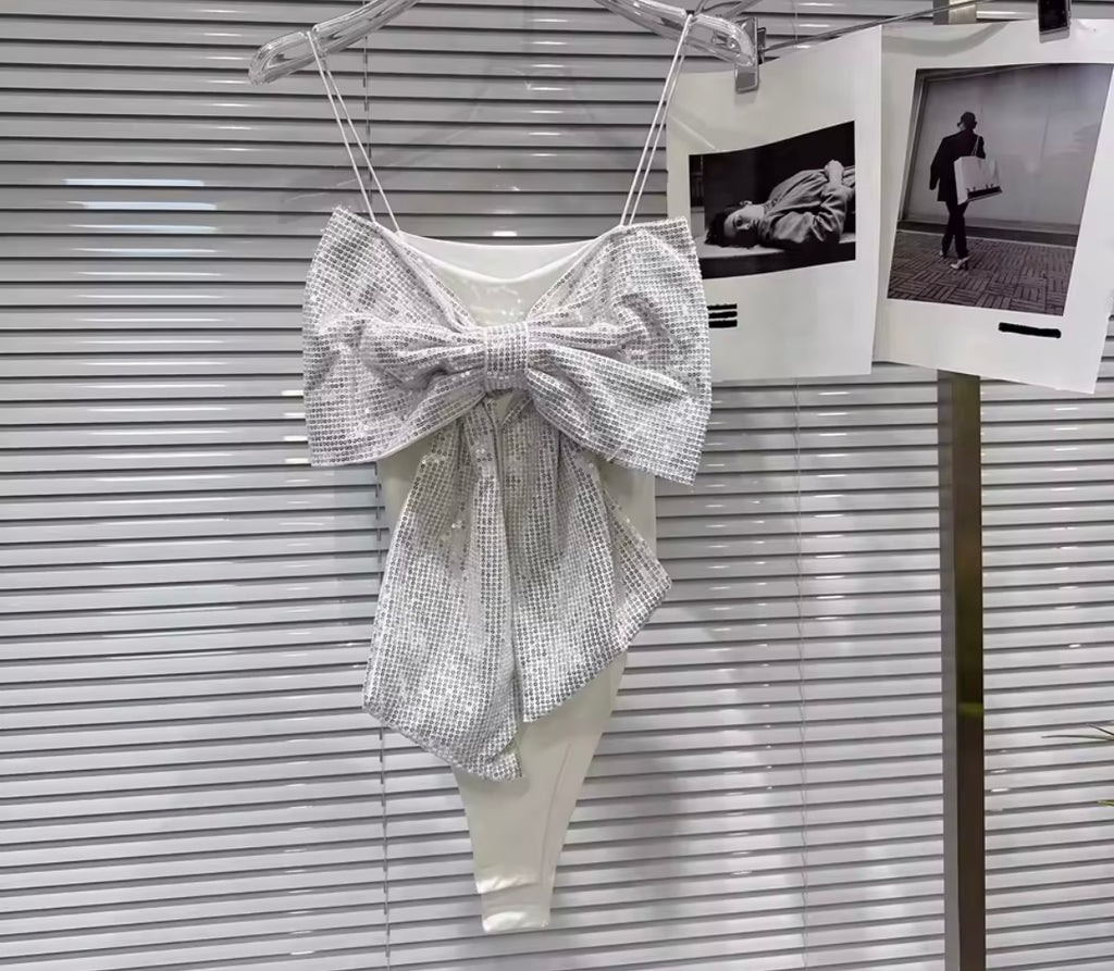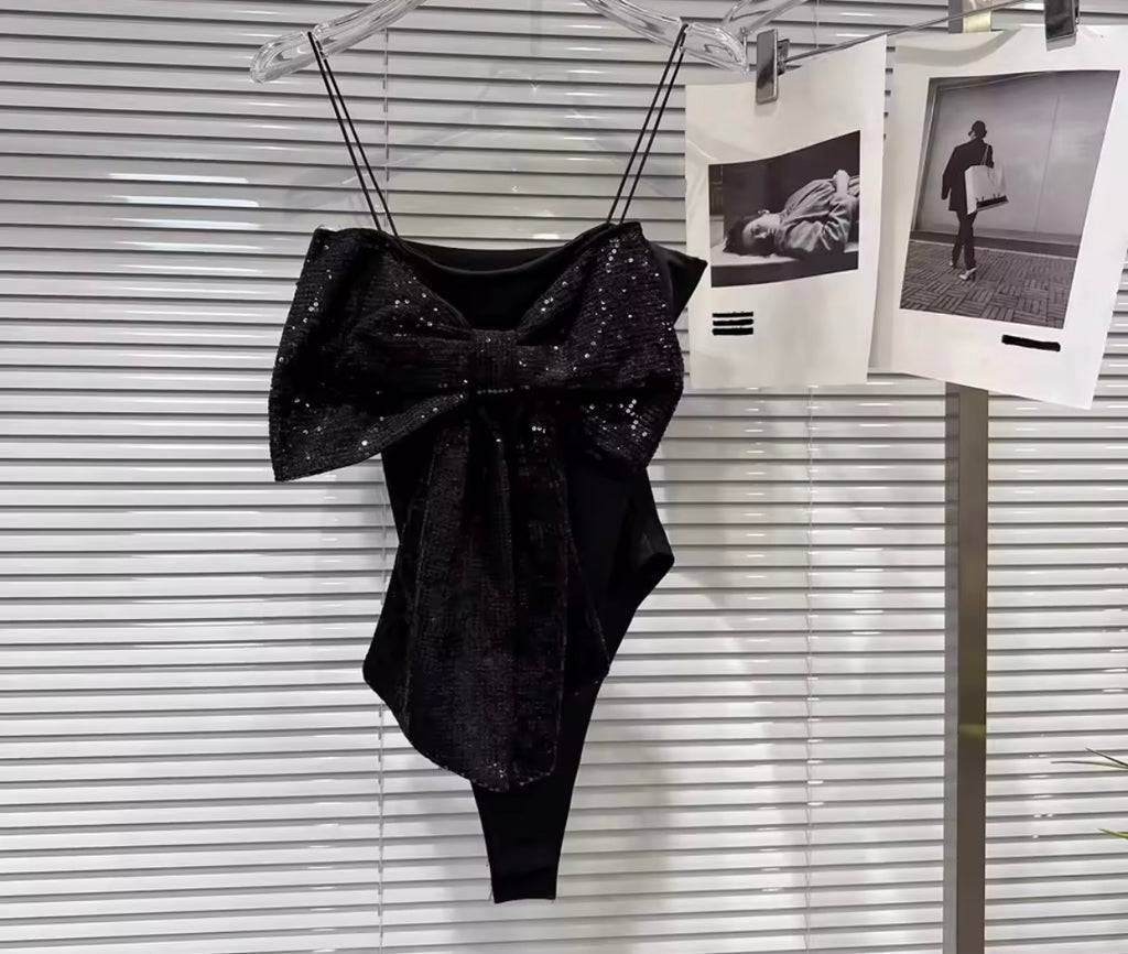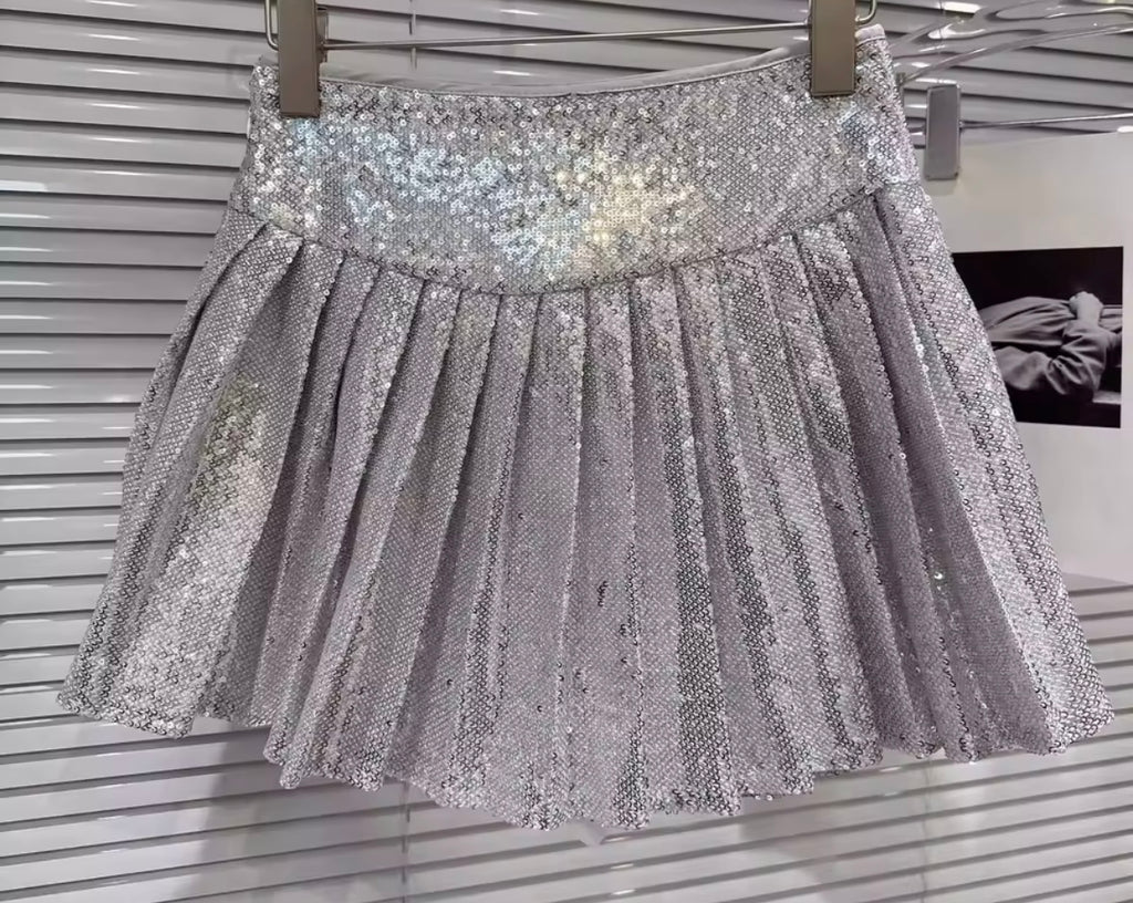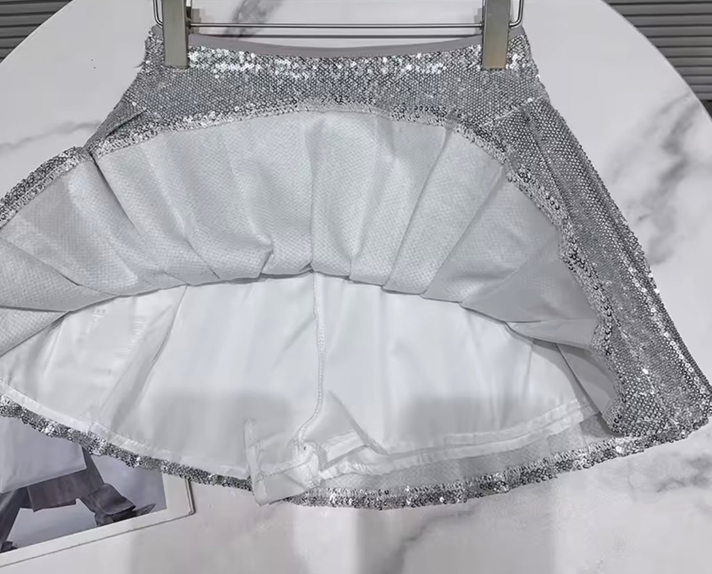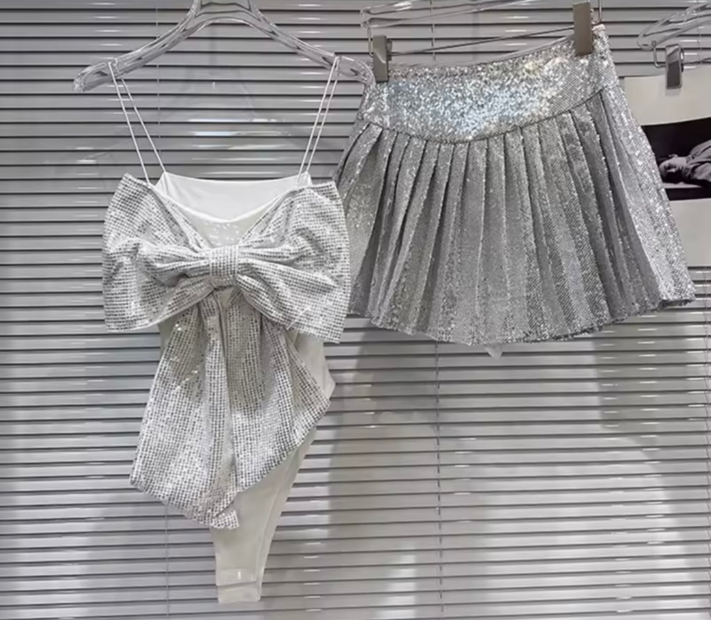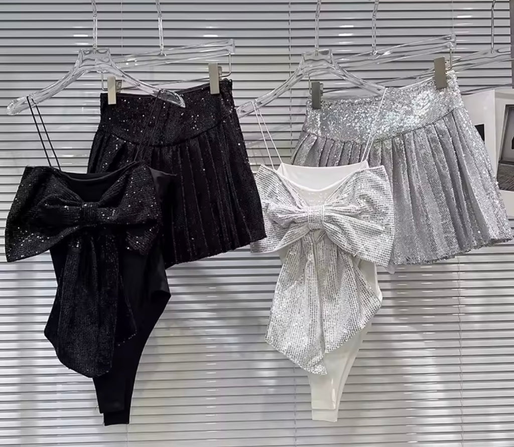Women Ruffled Bow Tie Full Sleeve Two Piece Bling Skirt Set