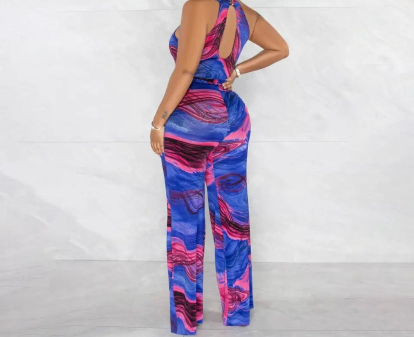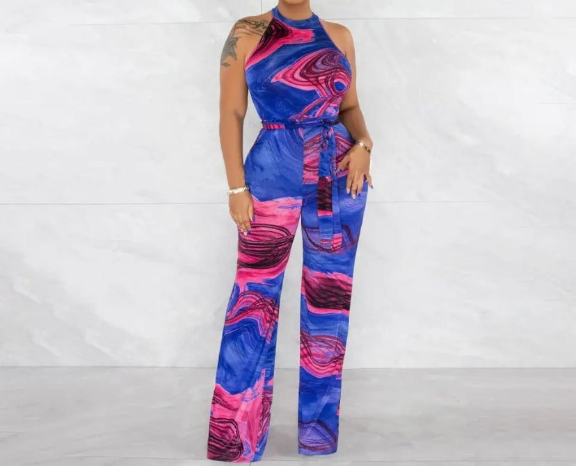 Women Sleeveless Colorful Print Belted Wide Leg Jumpsuit