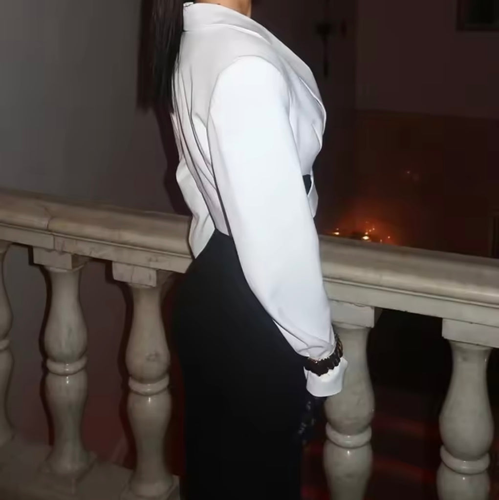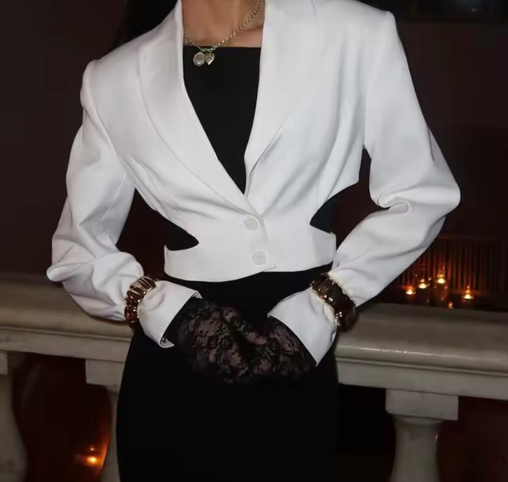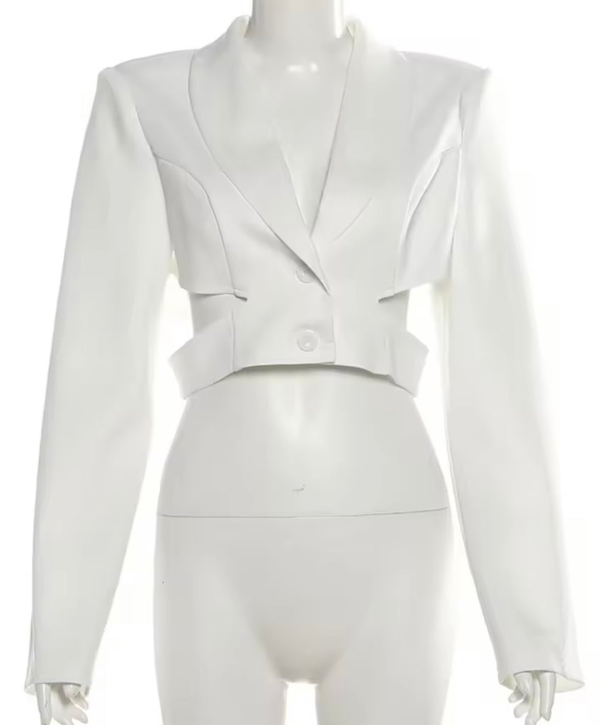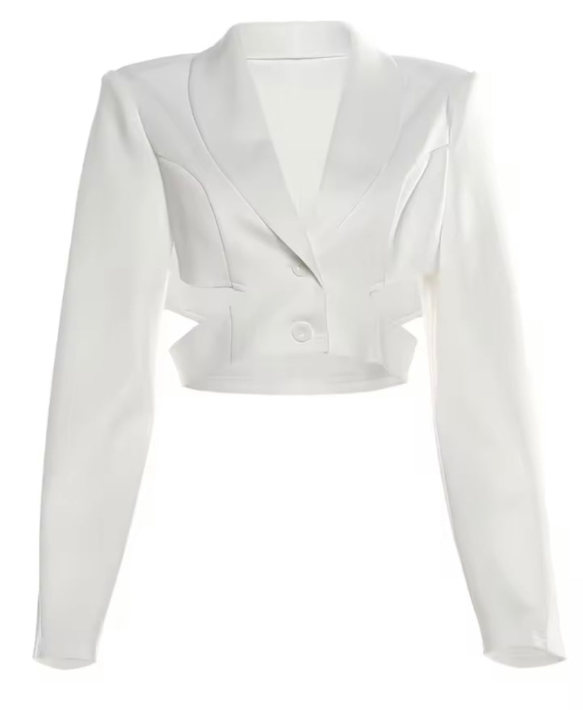 Women White Button Up Full Sleeve Cut Out Crop Blazer Top